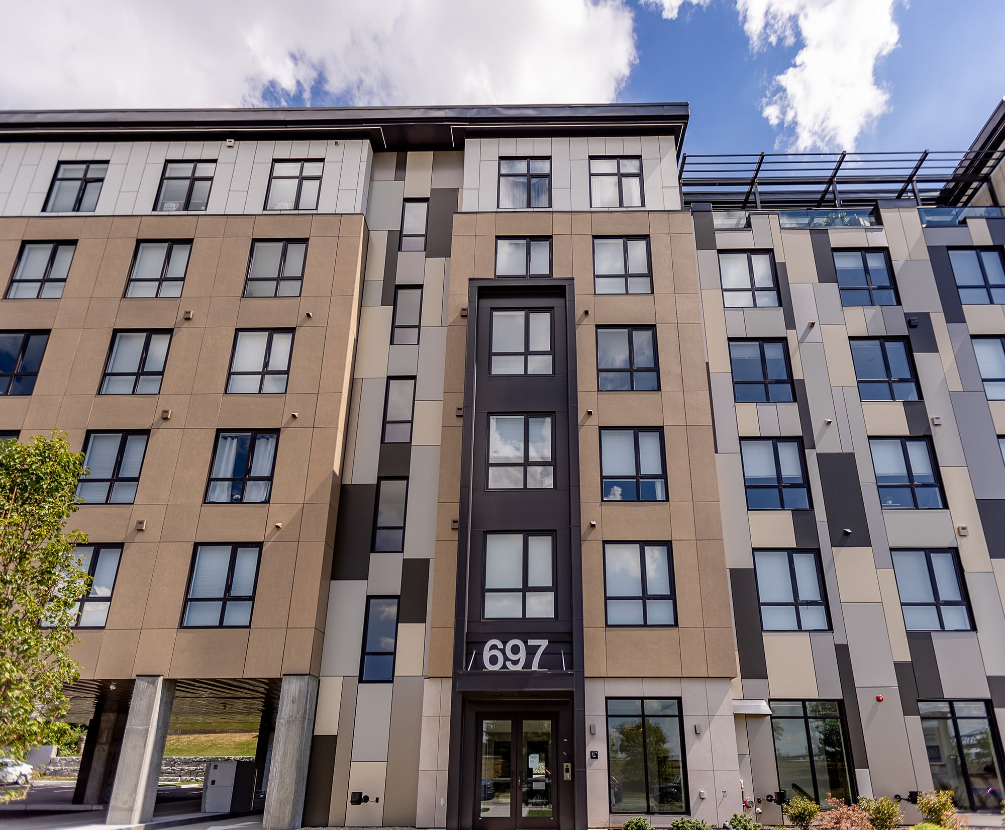 A gateway to the Waterfront Redevelopment in Fall River, The Residences at River Edge will be a catalyst for other development in this region. Anchoring the corner of Davol and Turner streets, this 6-story mixed-use structure is occupied by Bay Coast Bank on the ground floor and 49, one-and two-bedroom units on the upper five stories. The proximity to the proposed rail stop as well as the new waterfront development will attract a blend of young professionals as well as down-sizers to these market-rate apartments including amenities such as parking, unit storage, a tenant rooftop amenity deck, fitness center, and shared common lobby space.