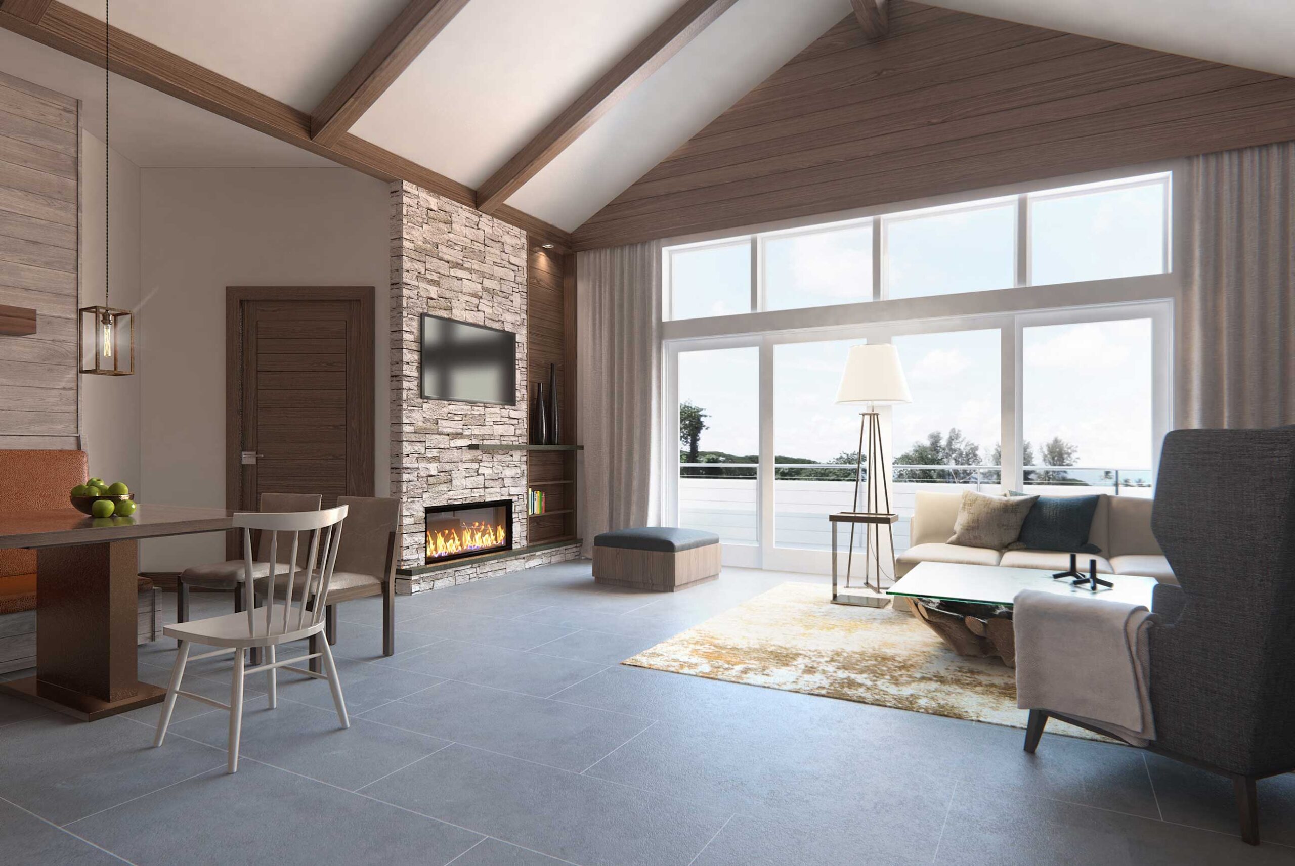 Genuine use of materials-wood, stone, slate- combined with textured fabrics, modern furnishings, and light fixtures forge the palette to which the guest comes in contact, evoking a sense of contemporary-rustic luxury.